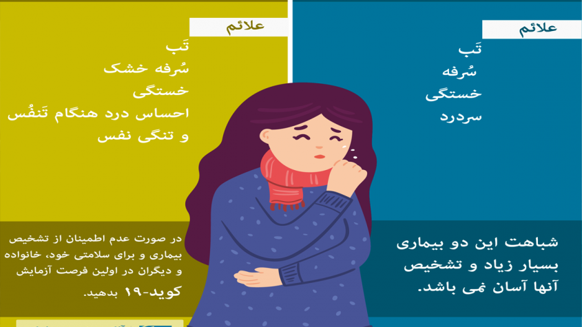 علایم ریزش یا زکام تب، سرفه، خستگی و سردرد و علایم کوید-۱۹ سرگیجه شدن، تب و لرزه، سرفه، ابريزش بینی و تنگی نفس می باشد که شباهت این دو بیماری بسیار زیاد و تشخیص آنها آسان نمی باشد.