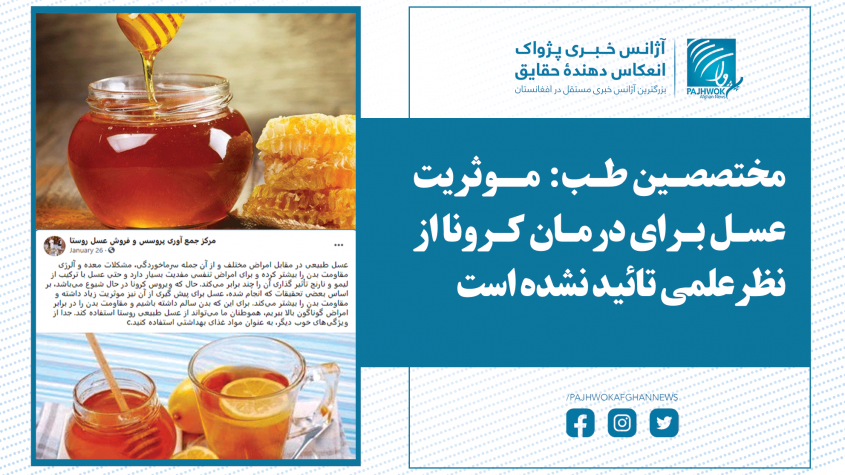 داکتر میرویس علیزی معاون سخنگوی وزارت صحت عامه، به پژواک گفت که تداوی کوید-۱۹مشخص میباشد و رژیم غذایی مختص به خود را دارد و تاکنون هیچ نهاد صحی، استفاده از عسل طبیعی را برای بیماری کرونا، توصیه نکرده است.