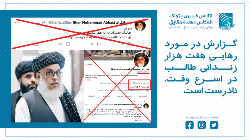 نتیجه: برخی رسانه ها بر اساس پُست تویتر معاون دفتر سیاسی طالبان، گزارش داده اند که هفت هزار زندانی طالبان آزاد می شوند و اسامی رهبران طالبان، از لیست سیاه حذف می شود؛ اما طالبان این صفحۀ تویتر را جعلی می خوانند و می گویند که عباس ستانکزی، هیچ صفحۀ تویتر ندارد.