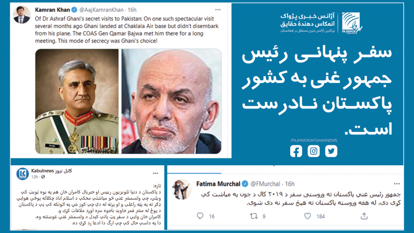 کامران خان رئیس تلویزیون دنیای پاکستان و خبرنگار مشهور، روز گذشته در صفحۀ تویترش نگاشته است که اشرف غنی رئیس جمهور افغانستان، چند ماه قبل به پاکستان سفر کرده و با جنرال باجوه رئیس ارتش پاکستان، ملاقات دو به دو داشته اند.