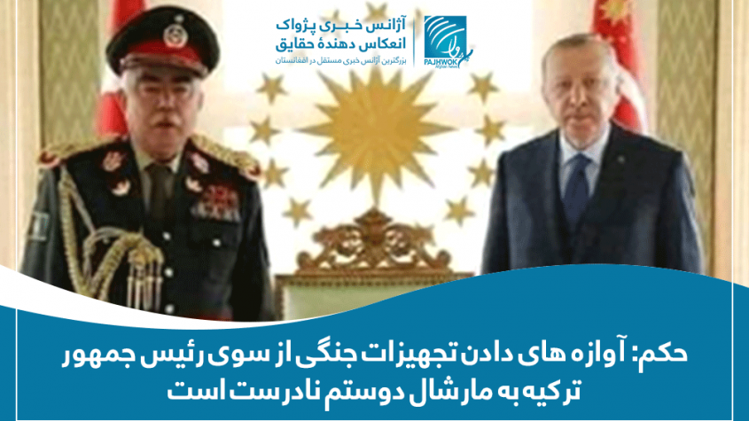 کابل (پژواک، اول سرطان، ۱۴۰۰): شایعات نشر شده در شبکه های اجتماعی که گویا رجب طیب اردوغان رئیس جمهور ترکیه، به مارشال دوستم امکانات جنگی داده و دوستم به زودی با این امکانات، دوباره وارد کشور خواهد شد، نادرست است.