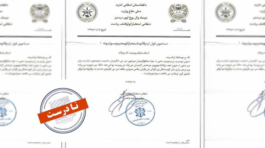 عنایت الله خوارزمی سخنگوی وزارت دفاع ملی به آژانس خبری پژواک گفت که این مکتوب جعلی است و آن را رد میکند.