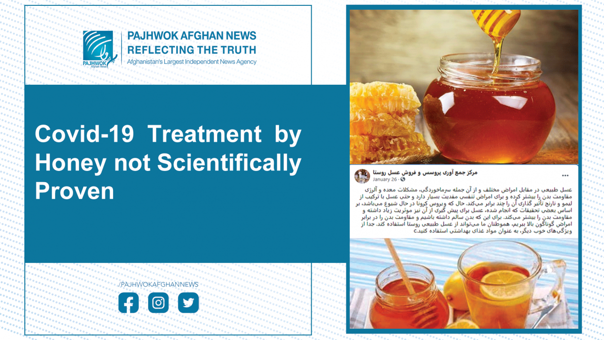 HakimullahSaleh, former Afghan-Japan Hospital director, said that honey was a healing liquid based on the prophetic medicine, but not at the level to cure Covid-19. He said that honey was not scientifically proven to be effective in treatment of the virus.