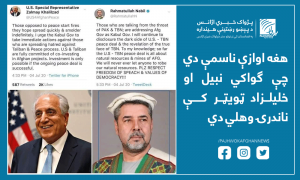 - د نبیل او خلیلزاد په نومونو لاس په لاس کېدونکي ناندریز ټویټونه جعلي ديکابل (پژواک، ۱۶ چنګاښ ۱۴۰۰): د ټولنیزو رسنیو ځینو کاروونکو ظاهراً د نبیل او…