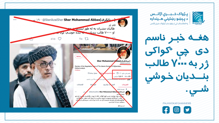 کابل (پژواک، ۶ غویی ۱۴۰۰): هغه خبر چې ژر به ۷۰۰۰ طالب بندیان خوشې او د طالب مشرانو نومونه به له تور نوملړه وایستل شي، ناسم دی او د «شېرمحمد عباس ستانکزي» په نوم له جوړ شوي جعلي ټویټر څخه خپور شوی دی.