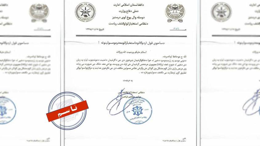 پایله: ملي دفاع وزارت وایي چې یاد شوی مکتوب جعلي دی او ردوي یې. د پوځي چارو شنونکی هم د بېلابېلو دلایلو له مخې دغه مکتوب جعلي بولي.